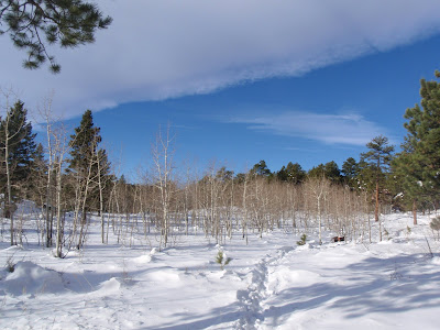 After I dropped off the pups at home, I went out for a bike ride on our dirt roads. It was, bar none, one of the messiest rides I've ever done. The snow was melting in the sun, creating a roux of mud and slush. My fenders worked well but even slow-moving vehicles sprayed me in mud. Moreover, parades of hunters drove back and forth along the road, visually searching for deer or elk, rather than braving the deep snow to hunt in the forest. The sheriff and a D.O.W. vehicle drove past me several times - I think that their hands were full trying to deal with people who thought that it was OK to hunt from a residential road. The most obvious scofflaw had removed both license plates from his truck. Unbelievable.